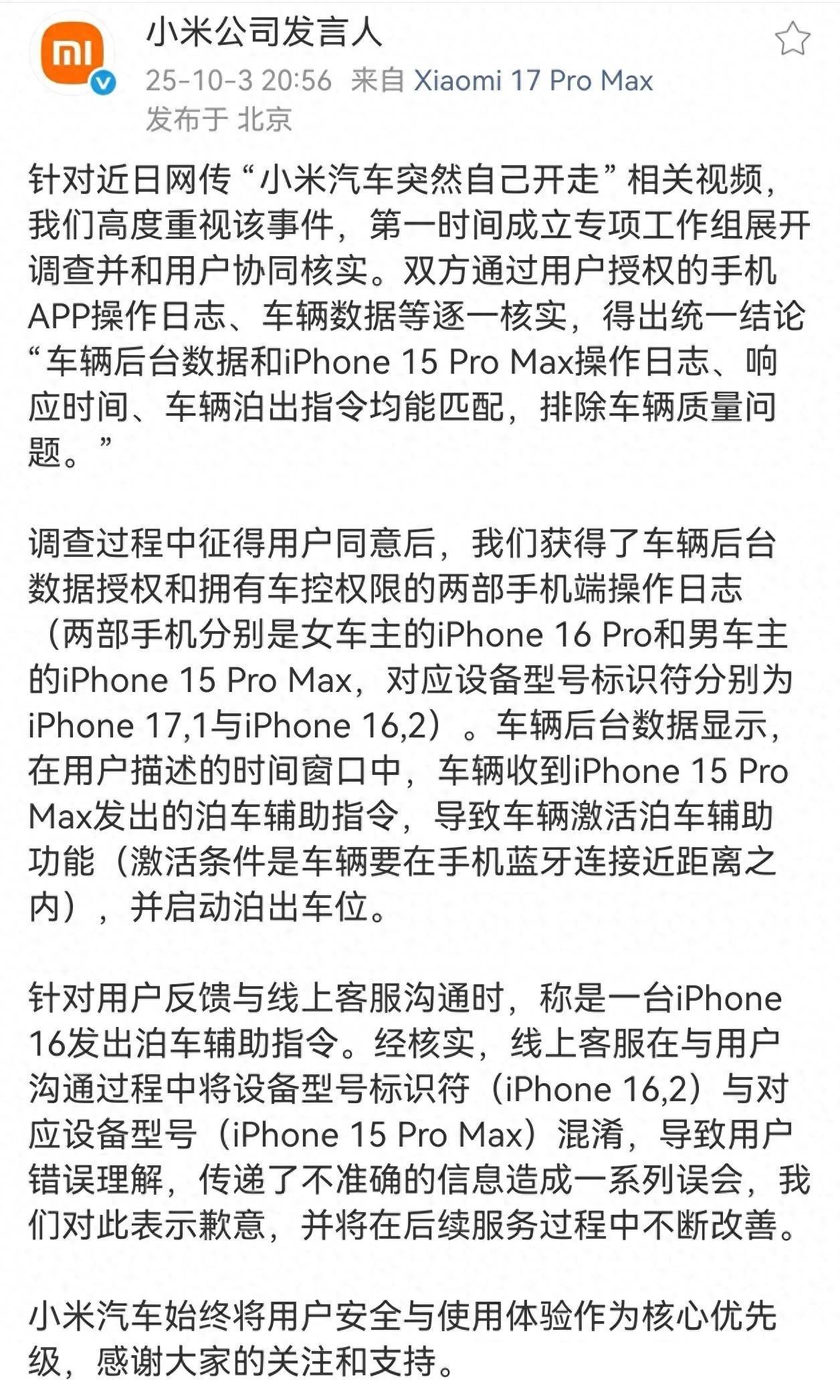 汽车突然自己开走,这样的消息有看头,很容易引发网络热议,何况还是小米汽车这样自带流量的品牌。所以,小米公司也是及时进行了回应。