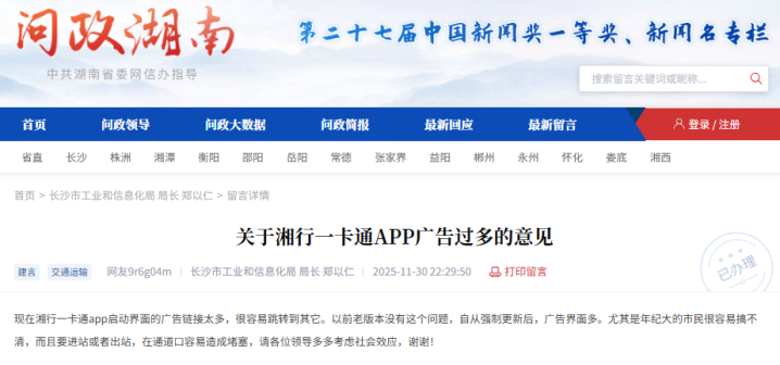 近日海纳策略,网友在红网《问政湖南》等平台反映,“湘行一卡通”App存在广告过多、易误触跳转等问题,严重影响使用体验。