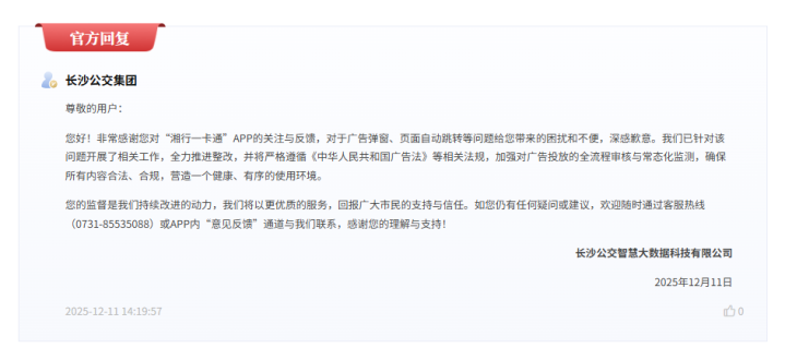 对此,长沙公交集团作出回应,向用户致歉并表示全力推进整改。回应称海纳策略,集团已针对广告弹窗和页面自动跳转等问题开展了相关工作,全力推进整改,并将严格遵循《中华人民共和国广告法》等相关法规,加强对广告投放的全流程审核与常态化监测,确保所有内容合法、合规,营造一个健康、有序的使用环境。
